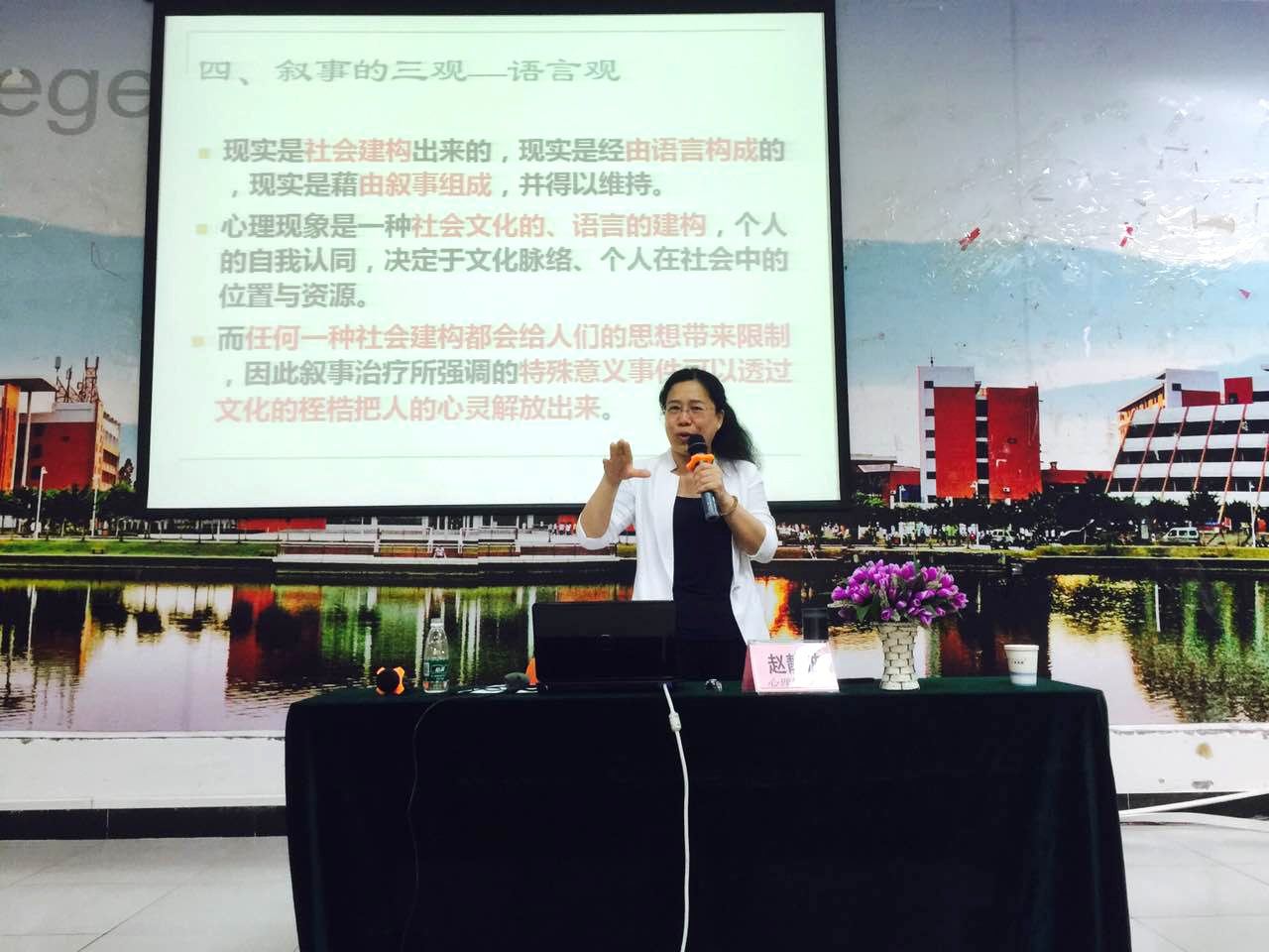 据悉,本次培训既是心理队伍建设的一部分,也是我校第八届525心理健康教育月系列活动之学术讲座活动。叙事疗法的培训是一项系统化的工程,我校将分期进行该专题的培训,切实提高心理健康教育工作队伍的专业化、规范化水平。