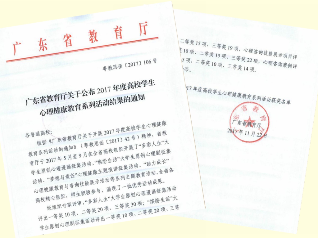 据悉,根据《广东省教育厅关于开展2017年度高校学生心理健康教育系列展示活动的通知》(粤教思函〔2017〕42号)精神,广东省教育厅于2017年5月至9月在全省高校组织开展了“助力成长”心理健康教育与咨询技能展示活动等系列主题教育展示活动。我校积极宣传、广泛动员,学生与教师踊跃参与,取得了本次展示活动的优良成绩,这不仅体现了广东省教育厅及专家评审班子对我校心理健康教育工作专兼职队伍职业能力的认可,也说明了我校高度重视心理健康教育三级心理健康教育工作,并在队伍建设方面取得的成果。