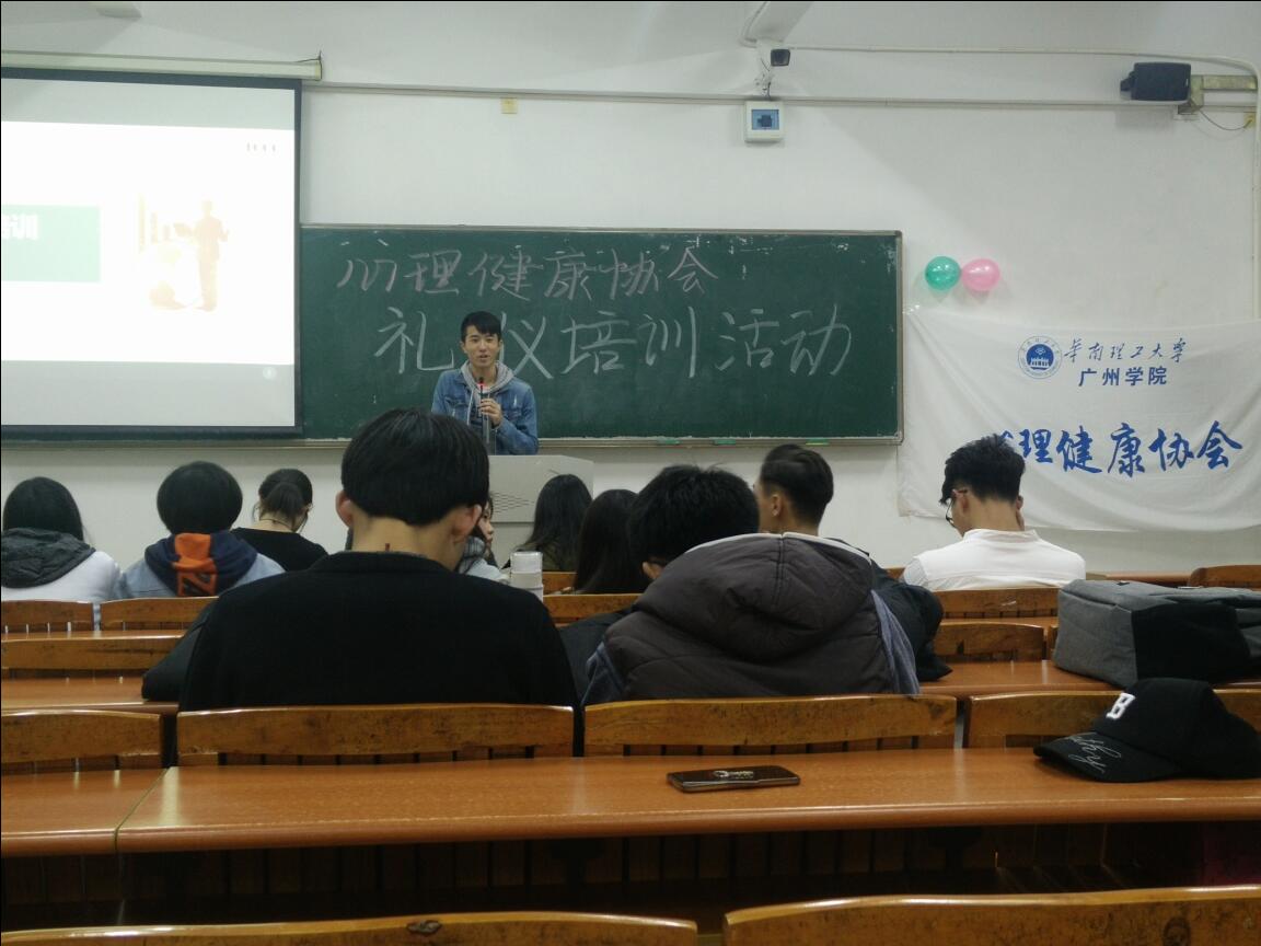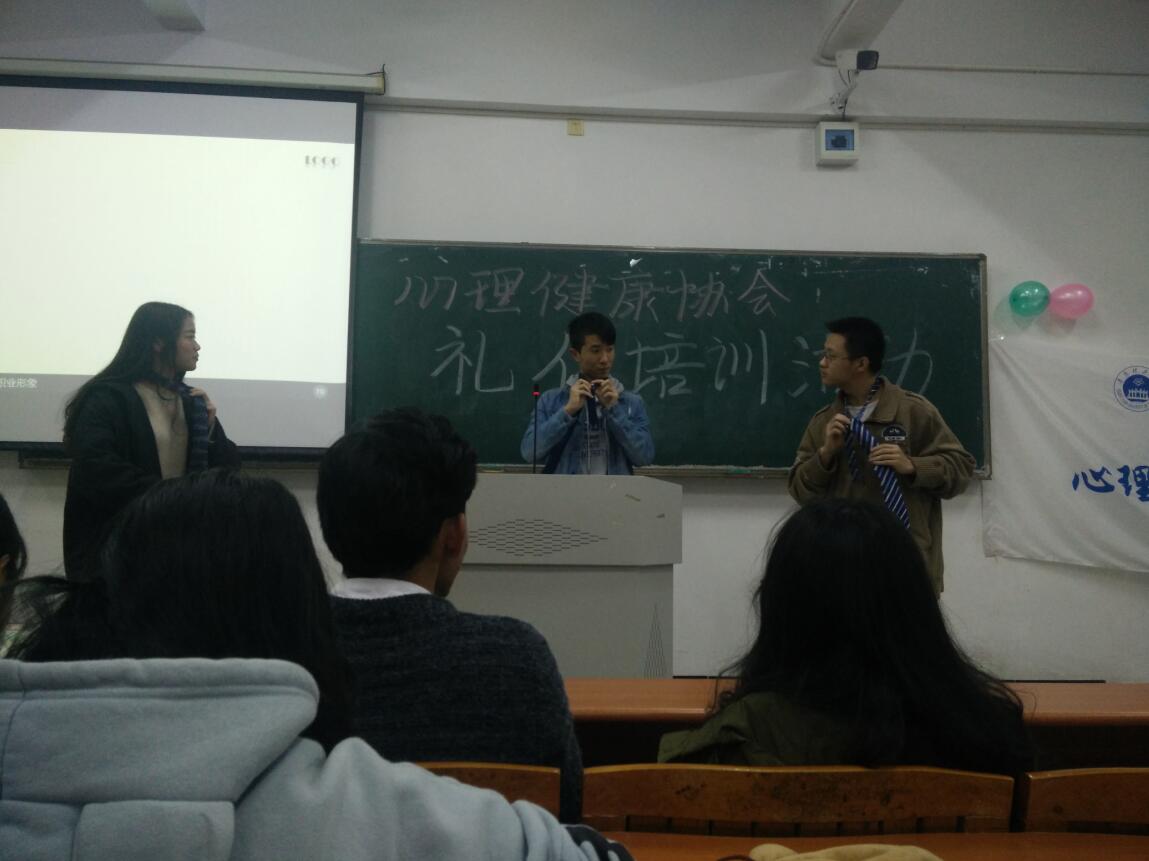 2017年12月14日晚,由心理健康协会举办的礼仪培训在A3-205举行,本次培训我们荣幸邀请到汽车与交通工程学院团委学生会公关部部长曹智当任主讲人,为我们讲解了我们生活各个方面的礼仪,给我们的日常带来极大的帮助。