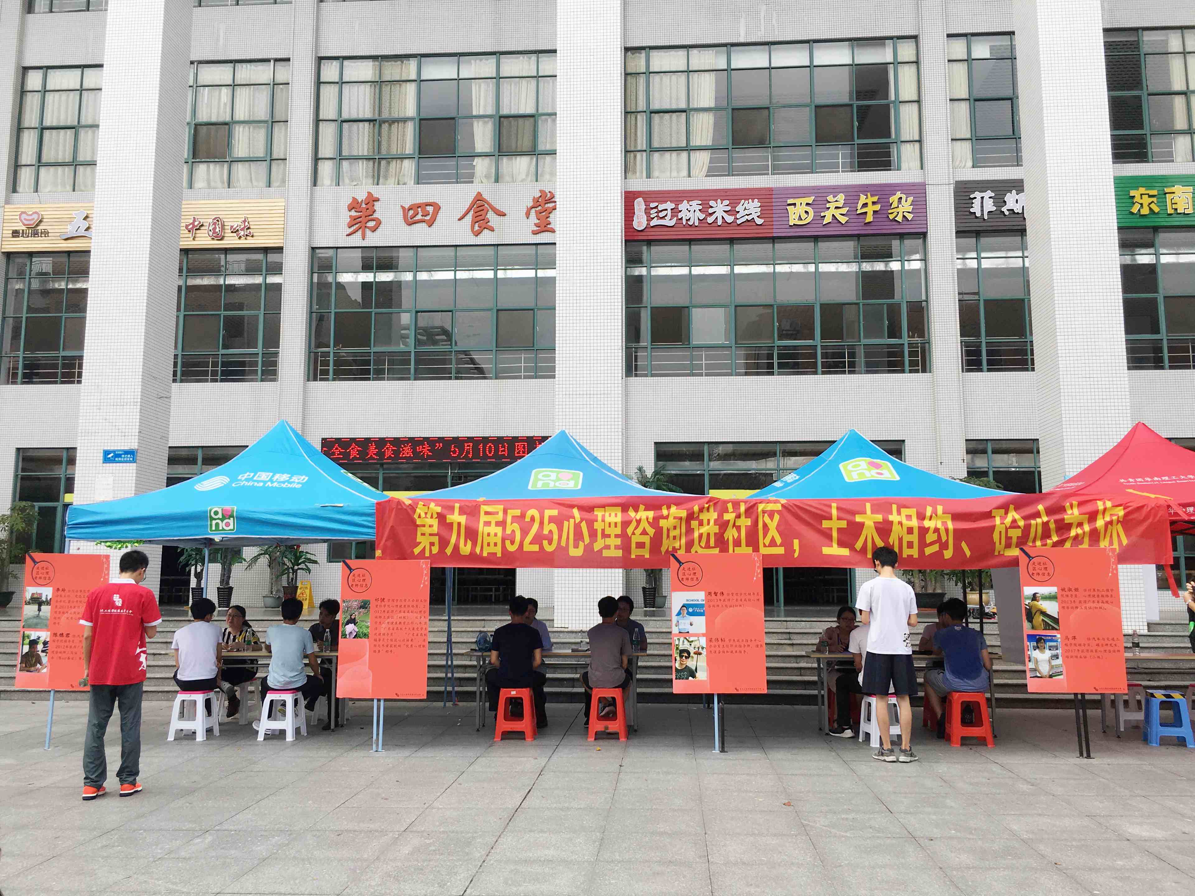 本网讯(记者 吴佳 鲁丹凤) 5月3日,C7篮球场、四饭堂广场被一群热火朝天的同学们“占领”,只见他们搭帐篷、搬桌椅、贴展板,忙得不亦乐乎,吸引了许多路过的学生驻足观看。当横幅挂起的那一刻,谜底揭开,原来是第九届5·25心理健康活动月之“心理咨询进社区活动”在此举行。