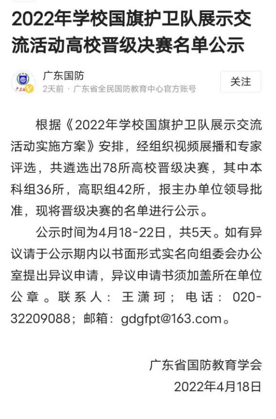 3月16日至4月15日,由广东省教育厅、广东省国防动员委员会等单位联合举办的广东省第五届学校国旗护卫队预选赛在线上举行。活动旨在深入学习贯彻习近平新时代中国特色社会主义思想,习近平总书记在庆祝中国共产党成立100周年大会上的重要讲话精神,集中展示广东省新时代学校国防教育成果,着力提升学生国防意识和军事素养,激发学生投身军营、献身国防的热情。本次的学校国旗护卫队比赛,全省共有128所高校国旗护卫队报名,其中评选出78支高校队伍进入决赛。