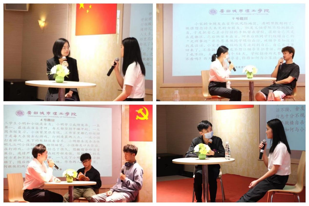 决赛采用主副评委制度,主评委由二级学院没有参赛选手的书记担任,副评委为由各二级学院选派学生代表担任。决赛的比赛形式为谈心谈话,此环节主要考察辅导员对相关理论与政策、学生特征的了解把握情况,对学生的教育引导效果以及沟通与提炼问题的能力。通过情景再现的形式,展现辅导员与学生们进行面对面地深入交流过程,谈话内容涉及思想政治教育、心理健康、日常管理、就业创业等多个方面。选手们用生动形象的例子、精湛的理论知识、深入浅出、用春风润物般的语言疏导同学们的情绪、引导他们认识问题、解决问题。现场吕诗老师通过对法律的仔细讲解,让学生深刻理解了我们为什么不可以随便在网络上传播他人隐私的照片或视频;师雯俏老师通过一个火车司机如何选择哪条道路的故事,让学生深刻理解了我们国家为什么执行现在的防疫政策,现场的师生都深有感触。