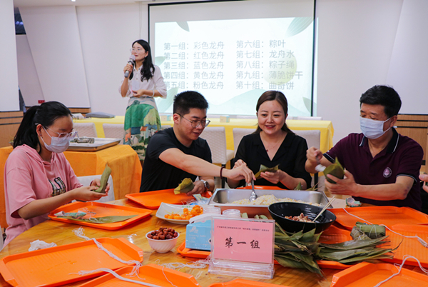 活动现场,为兼顾南北方甜咸口味,为大家提前准备了糯米、粽叶、蛋黄、红枣、鲜肉。杜小明和刘洊波与辅导员们一起随机分组,参与比赛。各小组热情高涨,积极参与,现场气氛温馨热烈、笑语欢声不断。大家比速度、比质量、比数量,短短半个小时内成果丰硕、亮点纷呈,在现场评选出“最美粽情奖”、“最浓粽香奖”、和“最佳粽情奖”。