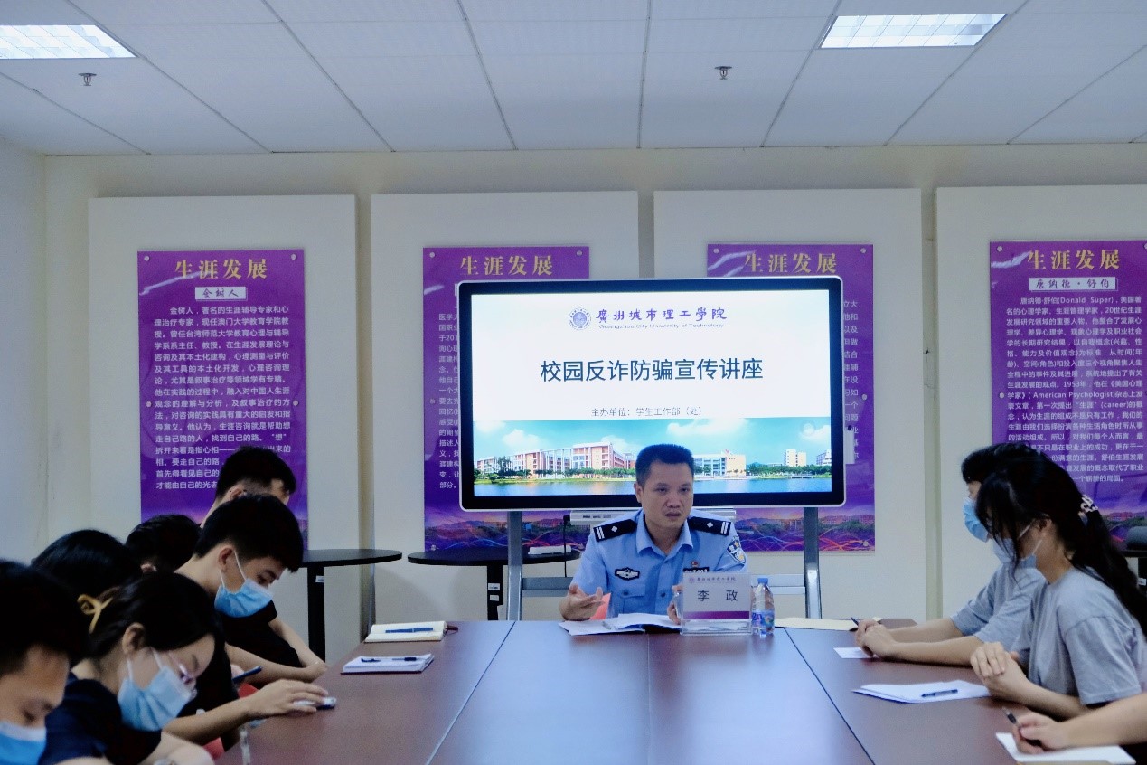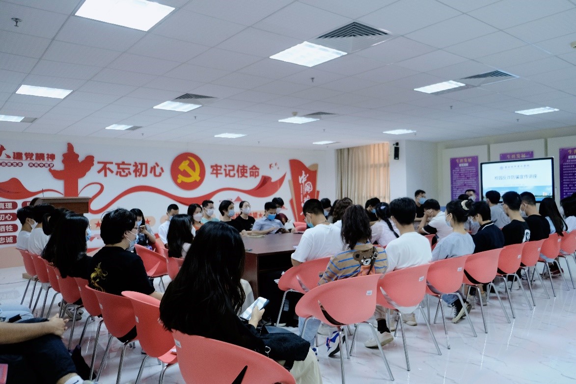 本网讯(记者 杨东烨)为进一步加强校园反诈防骗宣传,提高师生防范电信网络诈骗能力,营造平安和谐的校园环境,共创“平安校园”,9月1日下午,学生工作部(处)、校团委联合花都区公安分局秀全派出所在行政楼316开展“校园反诈防骗宣传讲座”。讲座由秀全派出所李政警官主讲,各学院辅导员代表以及学生骨干共48人参加讲座。