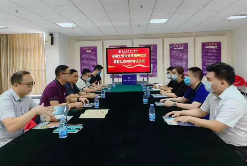 刘洊波率先为幸福生涯咨询室首批咨询师汪昊、林叙群、任春雯、罗自力、刘喜锋、陈磊、赖友新颁发聘书。随后,全体参会老师共同见证“幸福生涯咨询室”揭牌,“广州城市理工学院幸福生涯咨询室”正式成立。