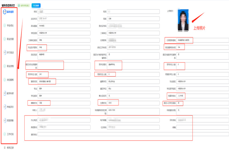 2.信息审核:学生工作部(处)负责审核全校辅导员信息,请全体辅导员逐项准确完善个人信息,不规范和不准确的信息需退回修订,确保各类信息完整准确。