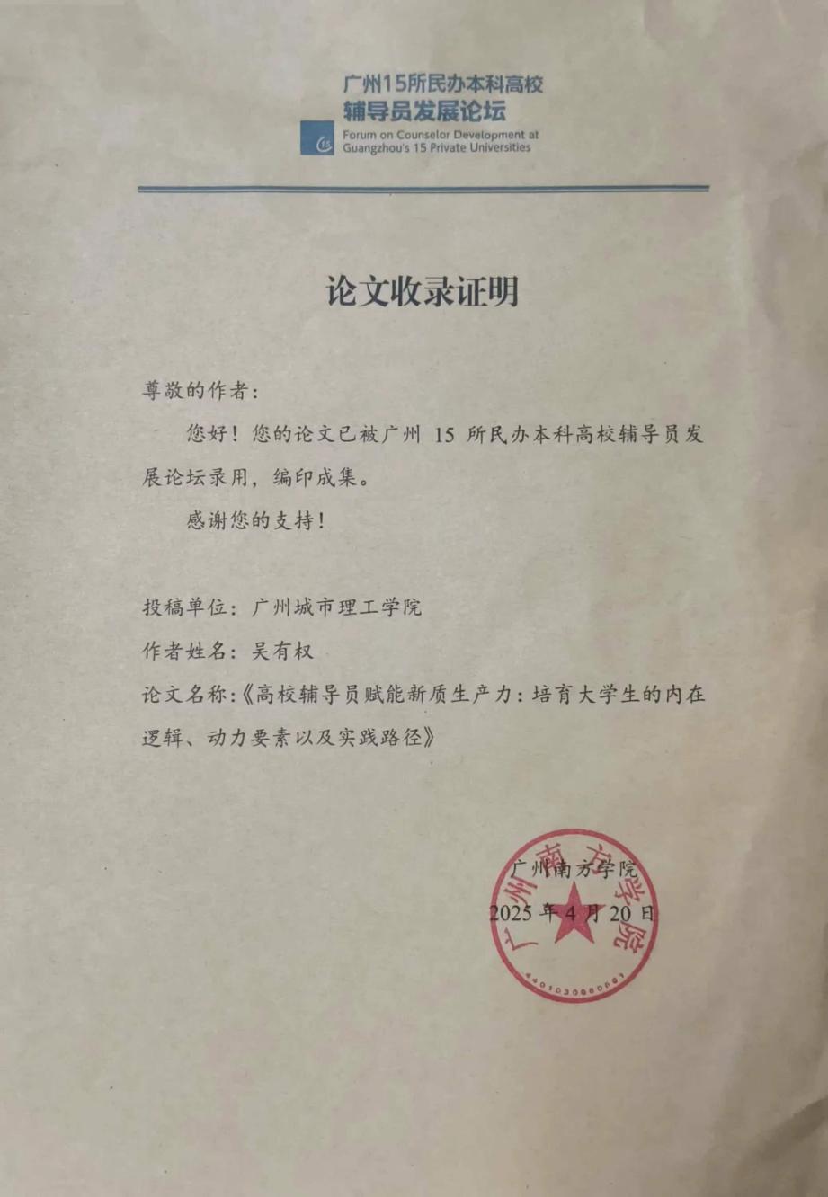 作为论坛成果之一,我校吴有权老师提交的《高校辅导员赋能新质生产力:培育大学生的内在逻辑、动力要素以及实践路径》入选论坛优秀论文集。