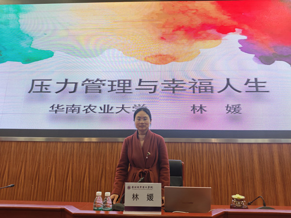 最后,我校特邀华南农业大学的心理专职教师林媛博士为全体辅导员开展以“压力管理与幸福人生”为主题的心理赋能讲座。林媛以近几年教师群体心理健康问题的调查引入,强调了教师与学生心理健康问题的共生关系以及做好压力管理的重要性。林媛介绍了压力管理的概念,指导大家在日常生活中可以通过识别压力来源、记录压力日志、调整认知心态等策略进行压力管理,中等程度的压力水平会带来最高的工作绩效。她表示,保持心理健康的关键在于积极应对外在环境的要求,依托马斯洛的需要层次理论,详细讲解了营造健康和谐的生活方式、增进幸福感的技巧,呼吁大家重视身心交互作用对心理健康的影响。