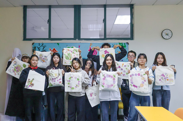 创作环节中,叮咚锤音化作心灵韵律,学生们将春色定格于帆布袋,“我以前只在书上看到过植物拓印,今天能亲手尝试,感觉非常有趣。”2024级学生张明政兴奋地说道,“通过这种方式,我不仅学习到了一门新的技艺,还感受到了传统文化的博大精深,增强文化自信。”2024级学生刘子建展示着作品说道,“采集植物的过程充满了惊喜,形态各异的植物有着独特的纹理和色彩,这让我第一次如此真切地感受到自然的丰富多样,也意识到这些平日里被忽视的植物,是如此珍贵的创作素材。”学校大学生心理健康教育与咨询中心负责人鲁丹凤指出,劳动教育能有效缓解学业压力,植物采摘过程既能培养观察能力,又能通过自然接触达到情绪疗愈效果。此次活动的举办,不仅丰富了学生的课余生活,还激发了他们对传统文化的兴趣和热爱。