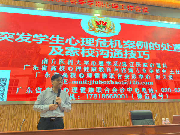 为增强培训实效,本次会议特邀南方医科大学珠江医院精神心理科主任、南方医科大学心理学系副主任、博士生导师赵久波教授作专题培训。赵教授以“突发学生心理危机案例的处置及家校沟通技巧”为题,结合2026年教育部“新春第一会”提出的“健康第一”理念和教育部印发的《关于全面推进健康学校建设的指导意见》精神,深入浅出地讲解了心理障碍的识别与干预、校园常见心理危机类型及预防策略、不同情境下的处置方法,以及在突发危机事件中如何与家长进行有效沟通。他用丰富的临床经验和真实案例,将专业知识与教育实践深度融合,既有政策高度,又有实操温度,赢得了现场教师的热烈反响。